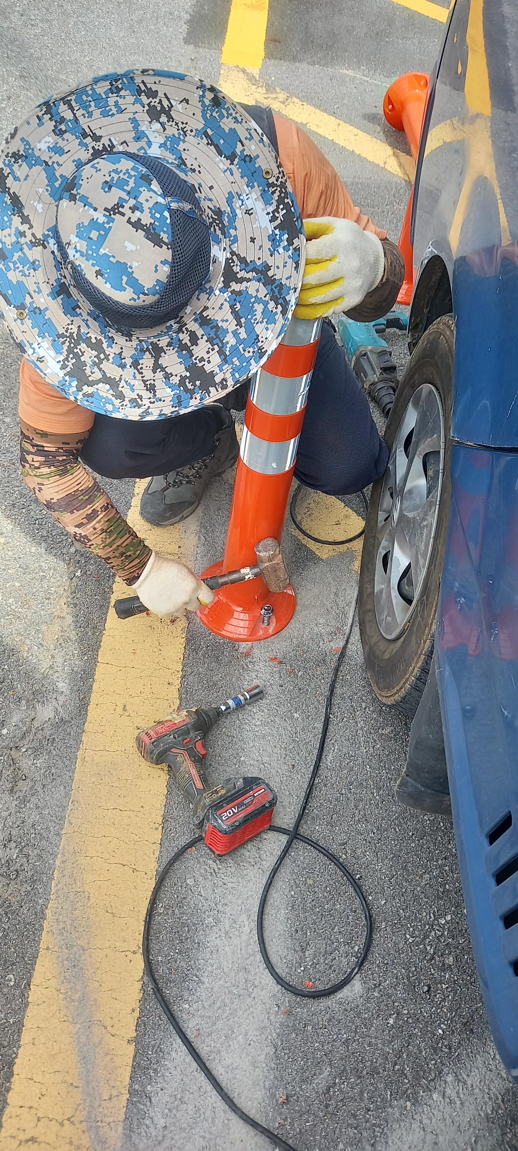 1) 설계도를 잘 확인해보고 줄자 등으로 잘 재보며 파란색 락카나 빨간색 락카로 탄력봉을 박을 구간의 표시를 해준다.(내가 했던 곳은 탄력봉 29개를 교통섬에 박는 작업이었다)