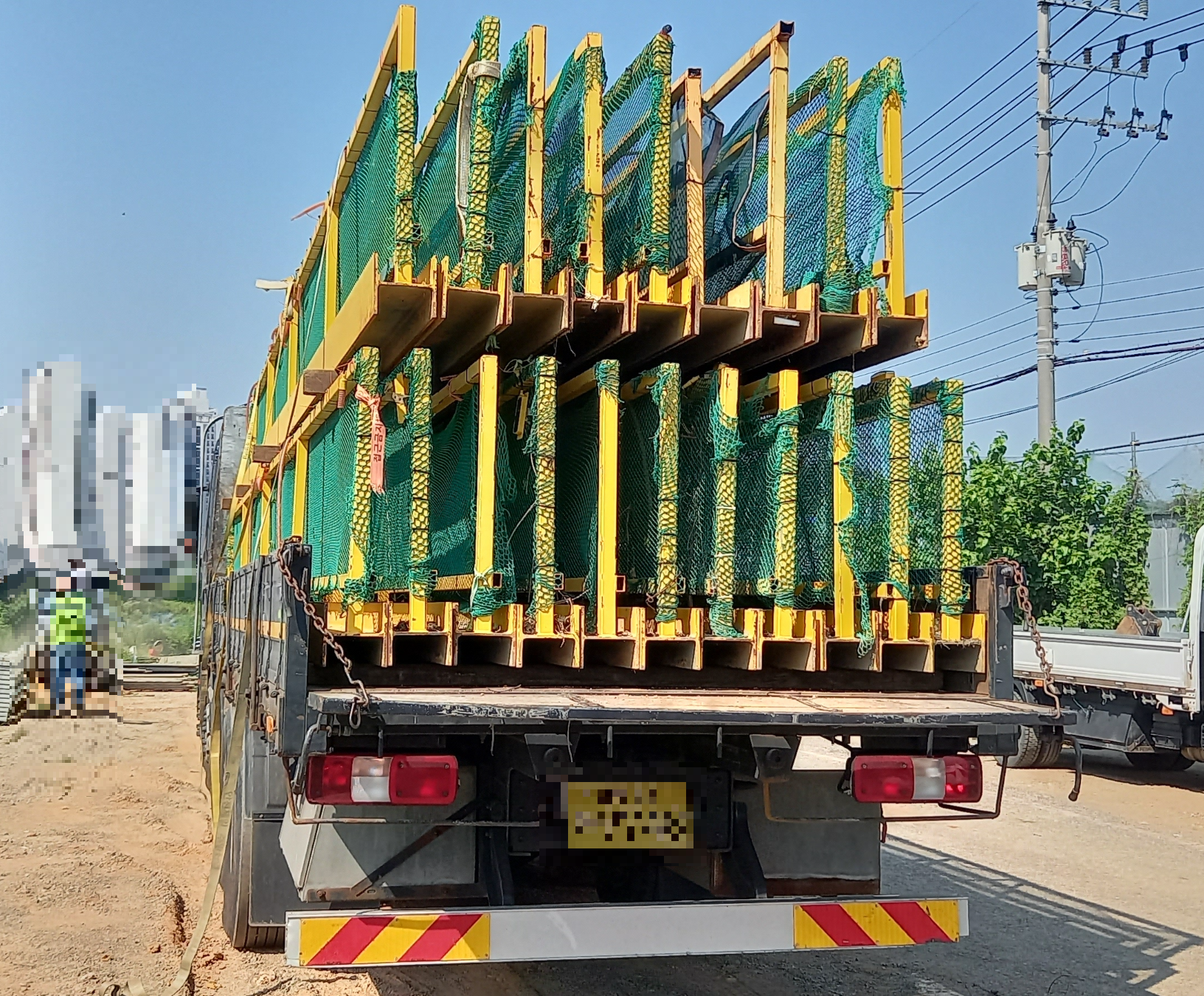 만약에 H빔에 흙이나 돌, 골재, 쓰레기 등이 많이 있으면 위의 사진처럼 망을 싀우는 것이 좋다. 25톤 트럭에는 저렇게 망이 준비가 되어있는것 같다.