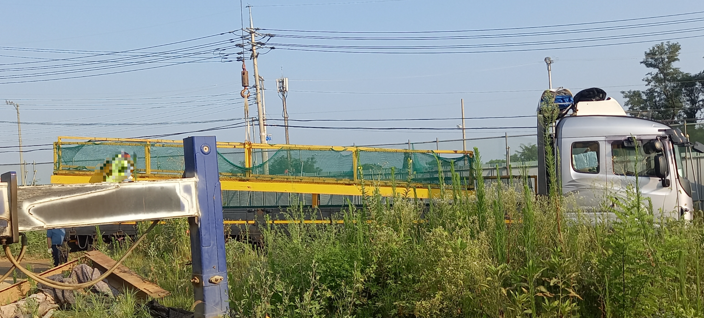 * 카고 크레인으로 10미터짜리 빔휀스 2개를 25톤 트럭의 짐칸으로 옮기고 있다.