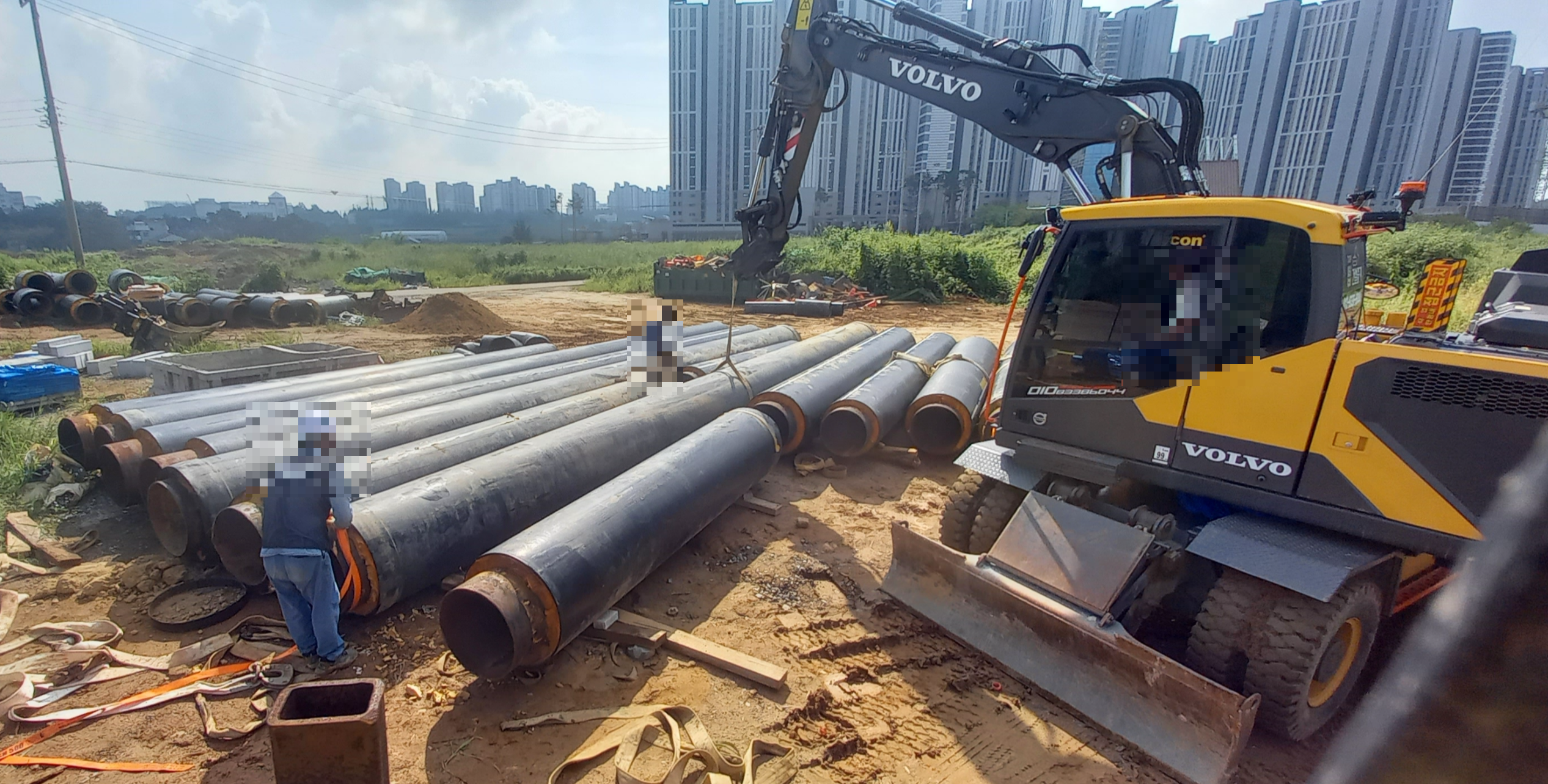 열배관 반납, 쐐기 제작, 포크레인으로 츄레라와 25톤 트럭에 배관 상차