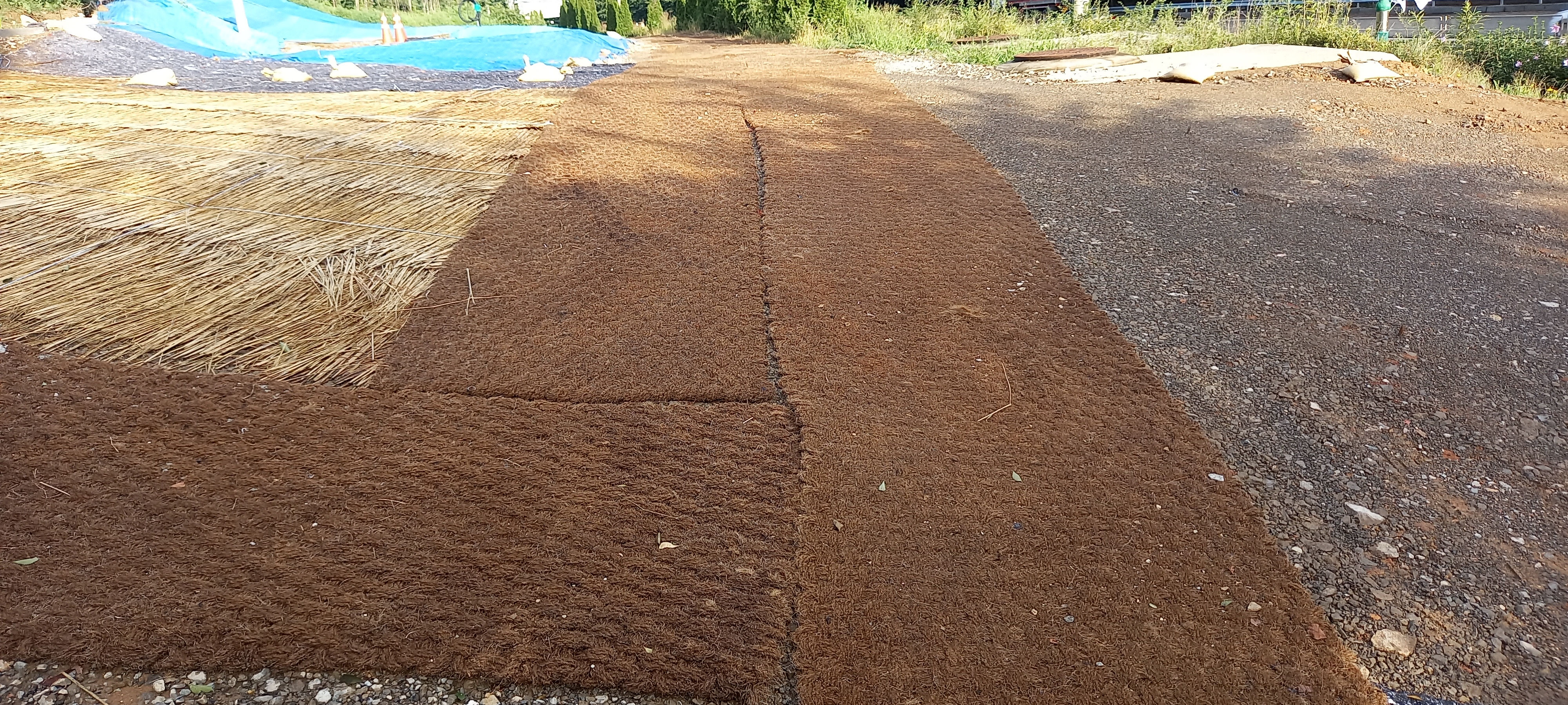 * 인도나 횡단보도 공사 현장에서 사람이 안전하게 지나다닐수 있도록 코이어 매트(야자매트)를 깔면 그 위로 사람들이 밟고 지나간다. 부직포보다 훨씬 더 안정적이다.