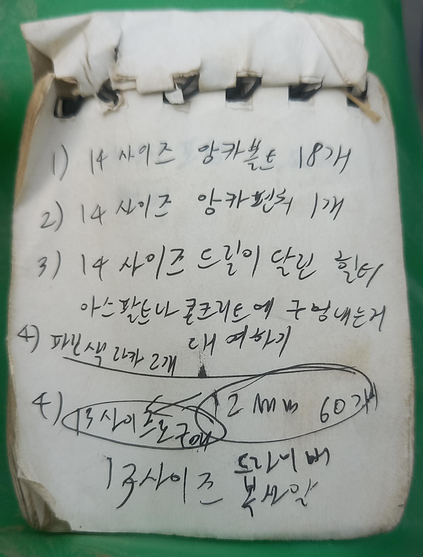 * 구멍을 얼마나 안쪽으로 깊이 파낼지도 길이를 알아야 한다. 그래야 앙카볼트의 길이도 알 수가 있다. 안카볼트의 7 전이나 5전 사이즈 등을 미리 알아두자. 뭉뚝한 쇠망치도 준비