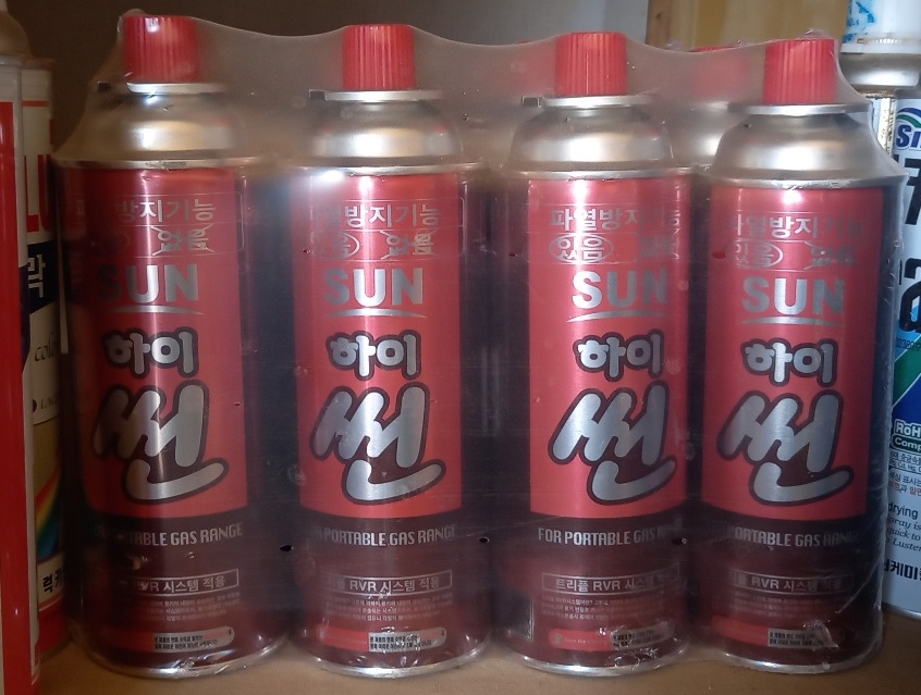1) 일반 부탄가스이고 많이 사용하는 하이썬 부탄가스이다. 토치를 장착해서 사용한다.