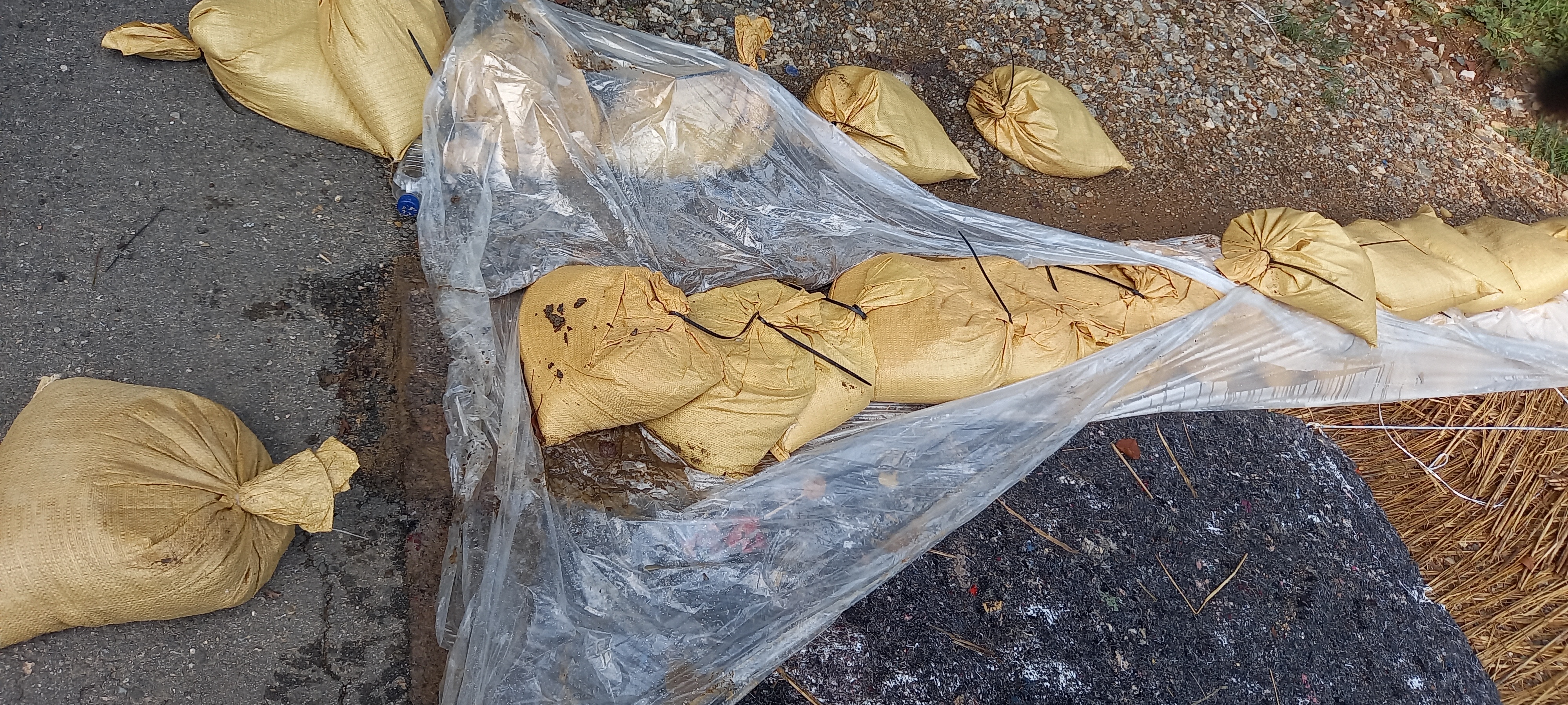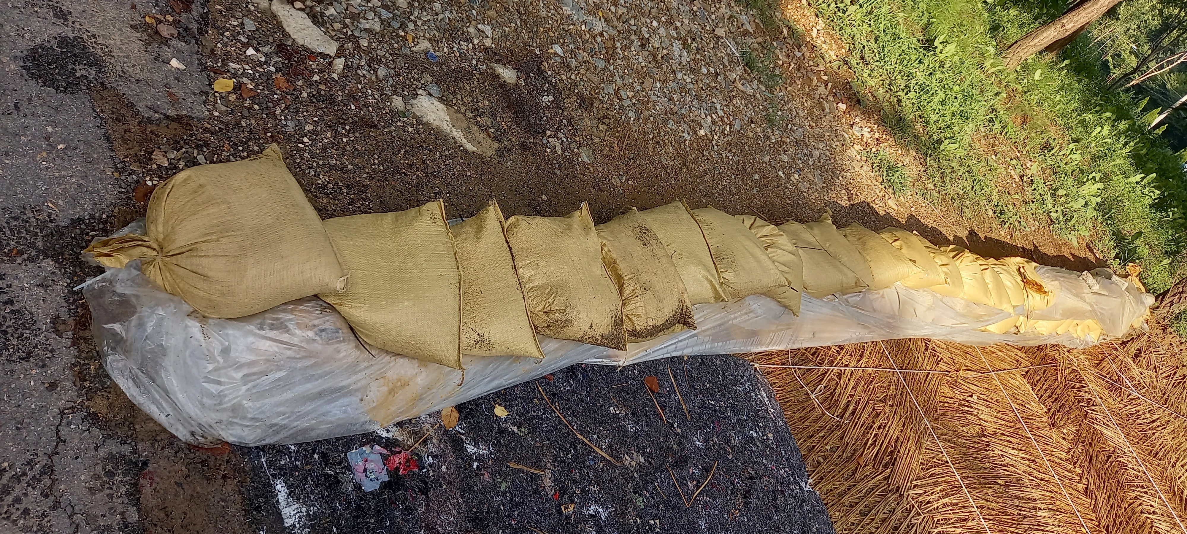 공사중인 도로나 산비탈길에 비가 내리면 안전 사고가 일어난다. 그것을 방지하기 위해서 비닐과 볼트마대(모래마대)로 둔덕을 만든다.