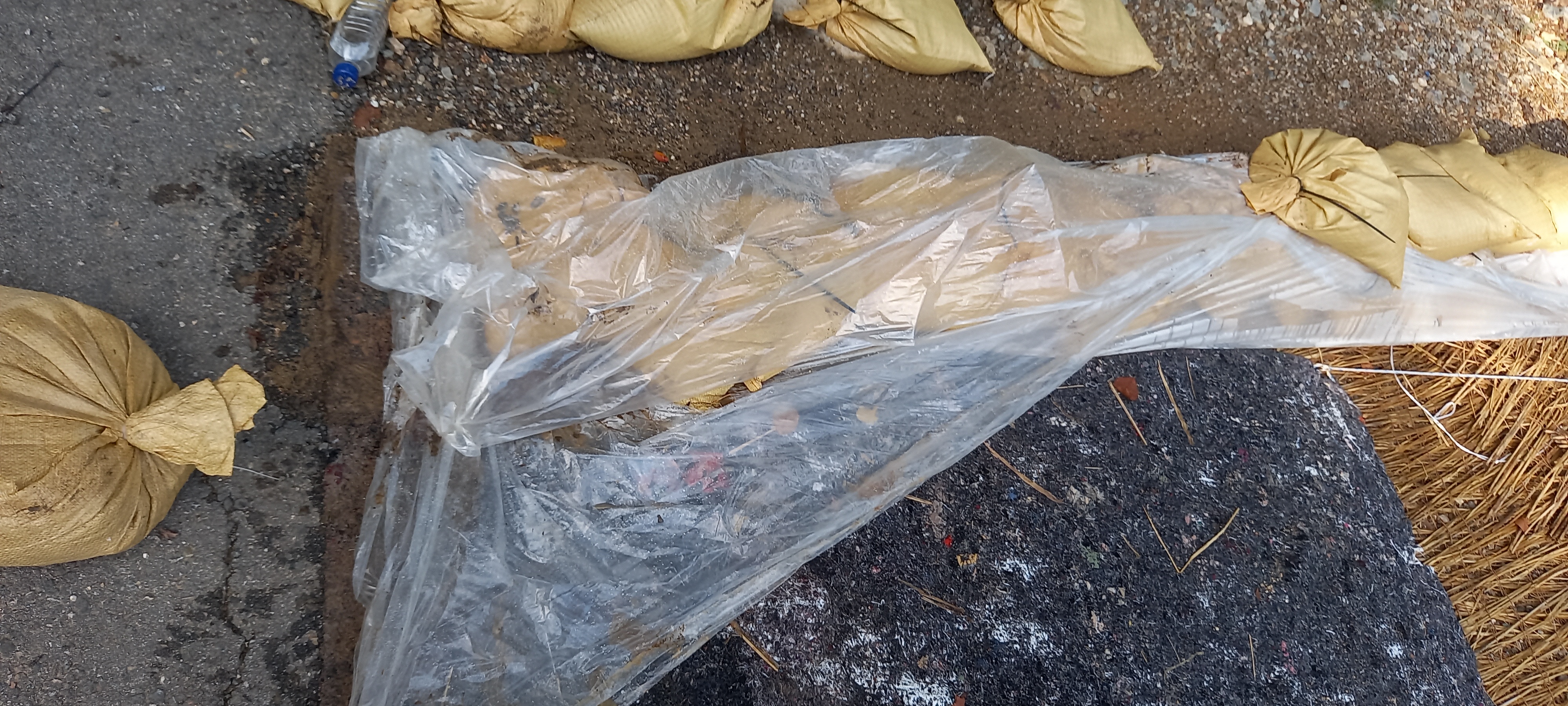 마지막으로 덮은 비닐 위에 모래마대를 또 얹어주면 완성이다.