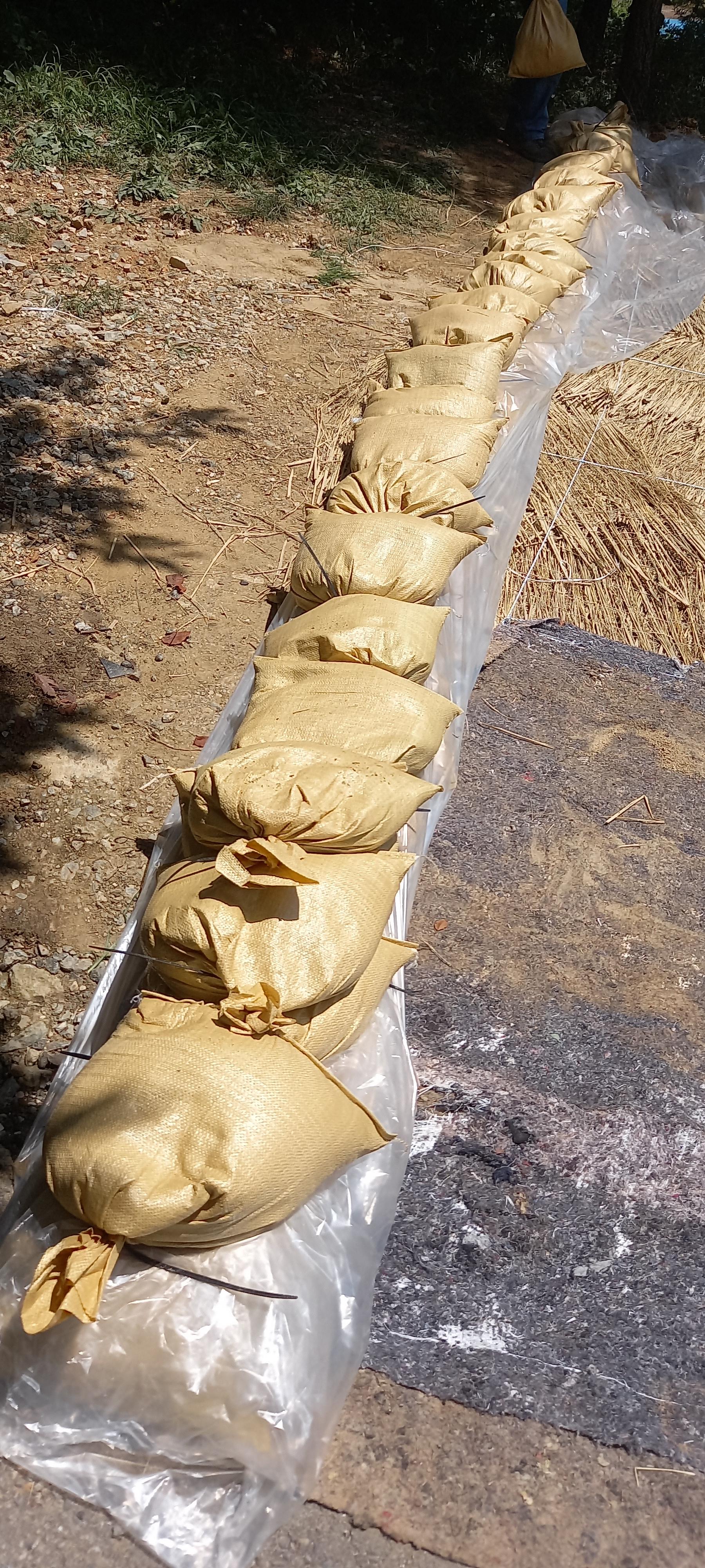 4) 비닐의 중간 55% 쯤에 만든 모래마대를 놓는다. 6.5m 정도 길이의 둔덕을 만드는 대에 모래마대 50개 이상이 필요하다.